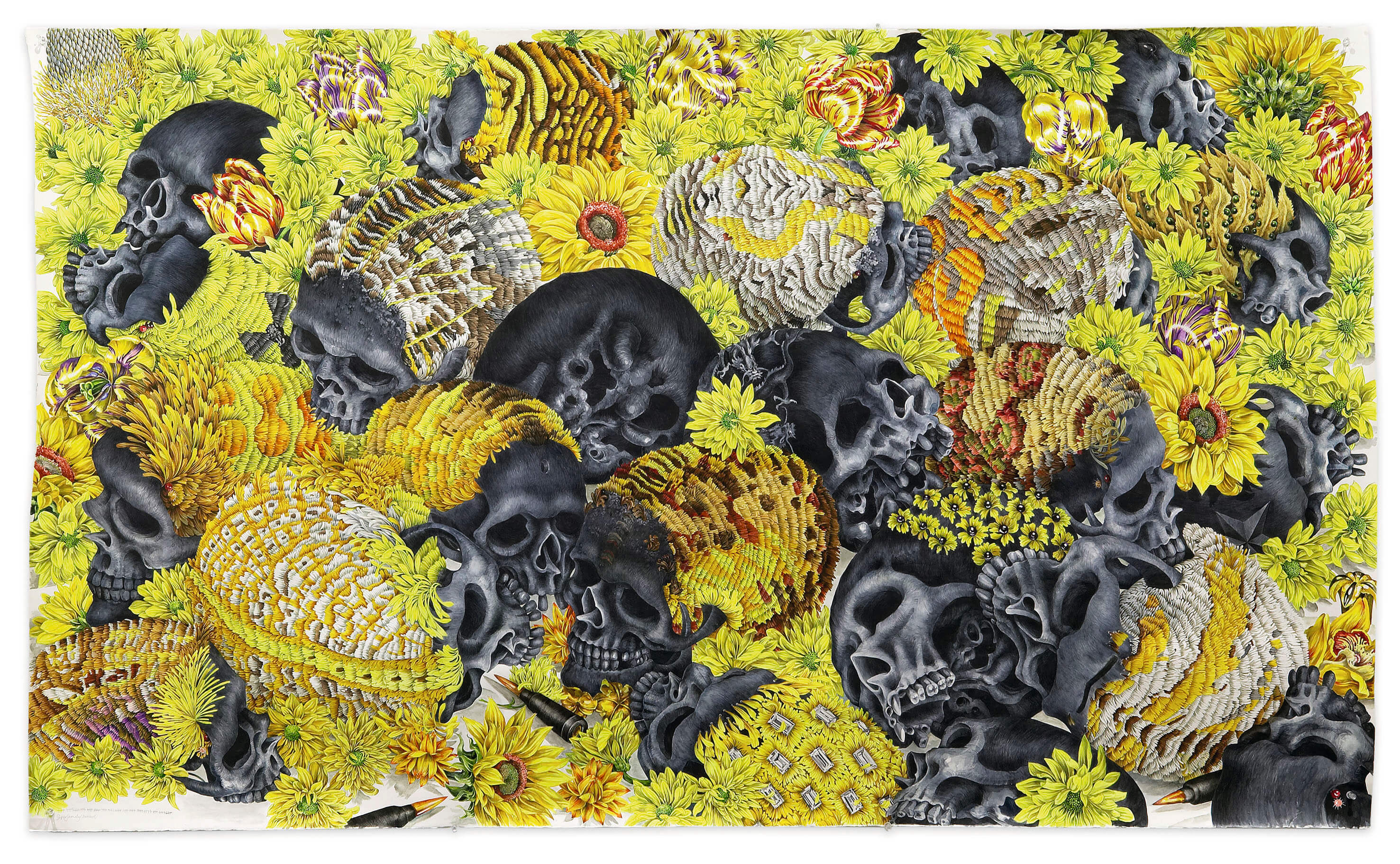 Medici’s The Theory of Everything painting is a colourful montage that harnesses a delicate value for life alongside the subtle nuances of warfare, authoritarianism and taunts of death, which ironically emit a peaceful humanist protest. Medici’s other works of artillery and floral paintings, skulls and helmets, is vast and poetically typifies the irony and metaphors of guns and roses, war and peace, life and death.